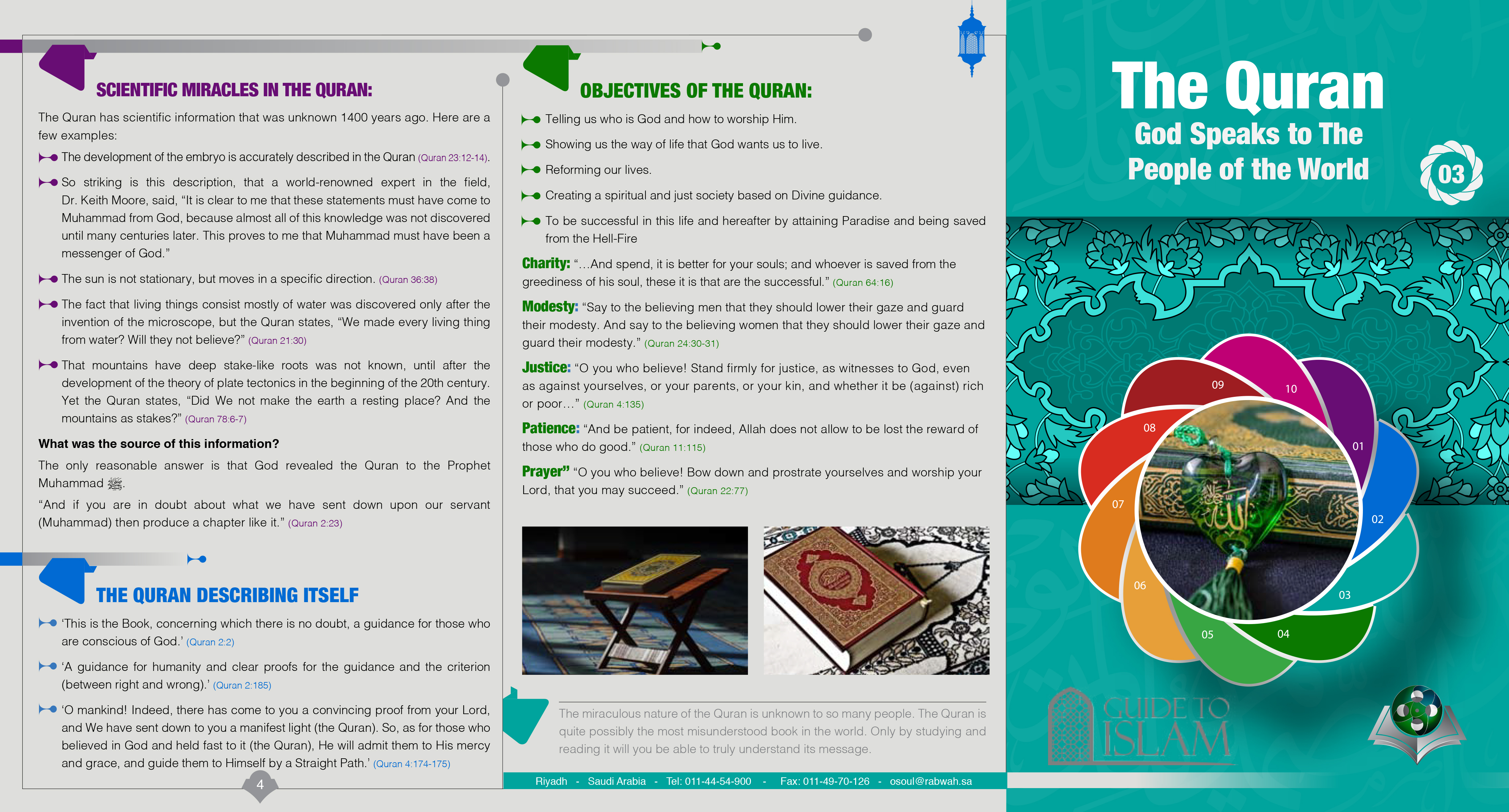 - تزويد المعارض الدعوية في المؤسسات والمراكز الإسلامية والخيرية بالمطويات واللوحات الدعوية؛ تسهل التعريف بالإسلام، وأصوله، ومحاسنه.